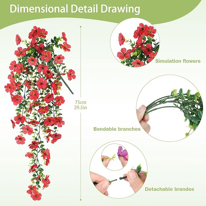 - Artificial Flowers for Outdoors: Our 6 Bundles of Artificial Hanging Flowers are beautiful and real,it includes purple x3 and red x3, soft petals,leaf texture clear, maintain their vibrant hues all year, making them ideal faux flowers for outdoor planters. Note: The product may have a slight smell during transportation. If used indoors, please ventilate before use.