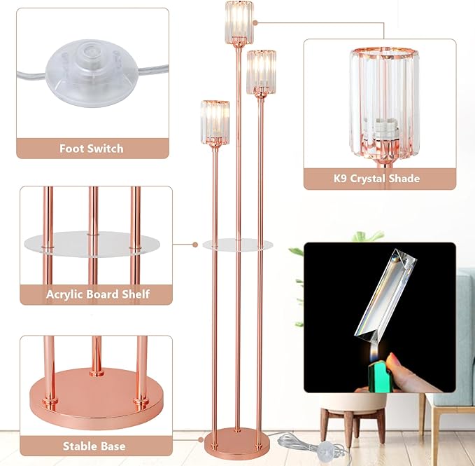 - 【Charming Crystal Lampshade】This pink floor lamp uses premium K9 crystal lampshade, the dazzling look brings a sense of class and elegance to your home. The stepped structure design of the pink lamp with crystal shade is mesmerizing and also brings 360° lighting. Compared with fabric or glass shade, girls floor lamp is undoubtedly more stylish and bright. The floor lamp with shelves will be a stunning glimpse in the corner of your living room bedroom.