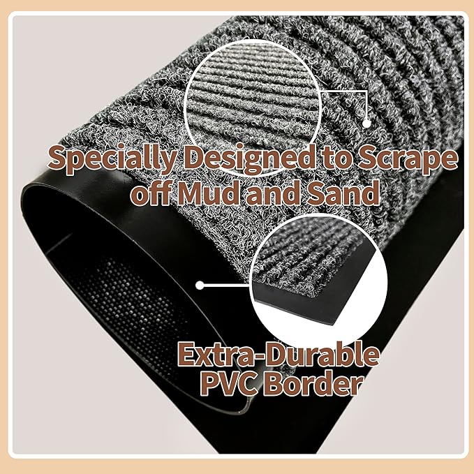 - Outdoor welcome mats for front door features a heavy-duty PVC backing with non-slip dots, paired with a polyester surface and grooved design, can scrapes mud and dust off shoes easily