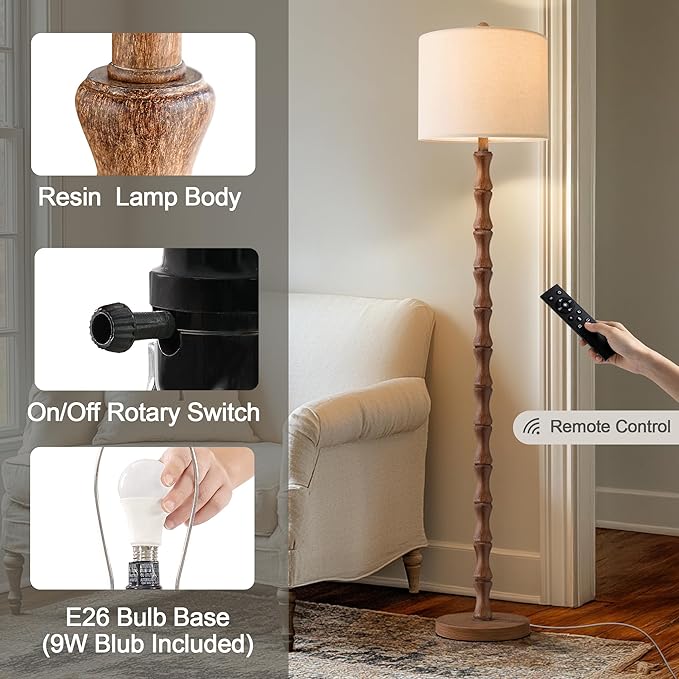 BOBOMOMO 62" Rustic Farmhouse Floor Lamp with Remote & Dimmable 9W Bulb, 3 Color Temperatures Tall Resin Standing Lamp, Retro Floor Lamp for Living Room, Bedroom, Office, Nursery, Reading Nock