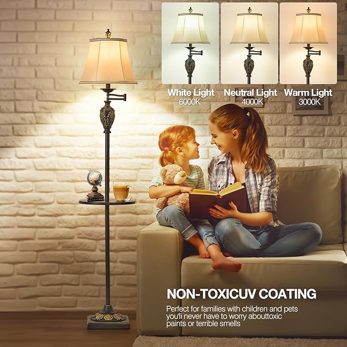 - TABLE AND ELEGANT LAMPSHADE-- We upgraded the Lamps,The middle part of the floor lamp has added a tray for you to place your belongings, or put a cup of coffee in the leisure time is also good. The lampshade is made from durable faux silk fabric, which makes the light soft, eye friendly and is easy to clean.