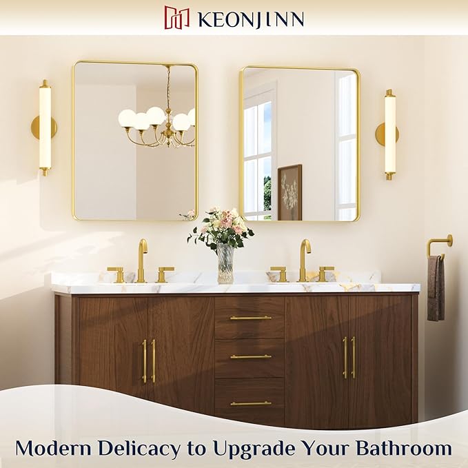 Keonjinn Gold Bathroom Mirrors for Over Sink, 24” x 30” Rounded Rectangle Brushed Gold Vanity Mirror, Anti-Rust Brass Mirror with HD Tempered Glass, Decorative Farmhouse Mirrors, Horizontal/Vertical