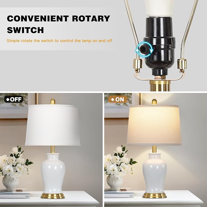 - 【Elegant Modern Style】The living room lamp features white ceramics and a brass color metal base. The perfect fusion of classic and modern, can add artistic atmosphere to your living room and bedroom. The ginger jar lamp is perfect for bedside, end tables, desks and beside sofas, add charm to your home or office. It's perfect decorative lamps to any living room, dining room, bedroom or entry