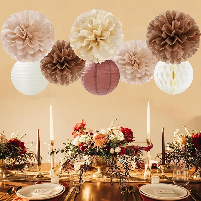 - BROWN PARTY DECORATIONS KIT:3pcs 12” brown champagne beige paper flowers, 6pcs 10” tissue pom poms,3pcs 8” lanterns,3pcs 8” honeycomb.
