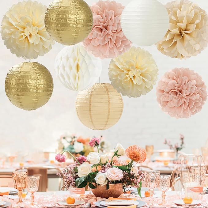- CHAMPAGNE GOLD BEIGE PARTY DECORATIONS KIT:3pcs 12” champagne beige paper flowers, 6pcs 10” tissue pom poms,4pcs 8” lanterns,2pcs 8” honeycomb.