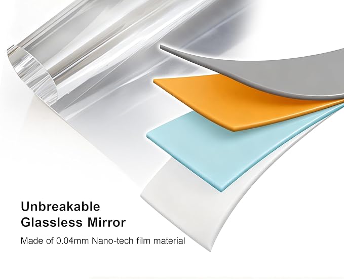 - ๐๐๐๐๐ซ ๐๐ก๐จ๐ข๐๐ ๐๐จ๐ซ ๐๐จ๐ฎ๐ซ ๐๐จ๐ฆ๐ Say goodbye to the worry of shattered glass. Our glassless mirror utilizes cutting-edge nano-tech film material to deliver a crystal-clear, distortion-free reflection without the weight and danger of traditional glass mirror. At just 1.3 lbs, it's not only shatterproof but also incredibly easy to handle and install. Itโs the ultimate safe choice for family homes with children and pets, providing unparalleled peace of mind.