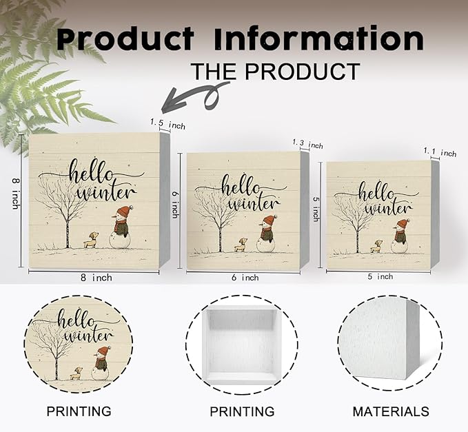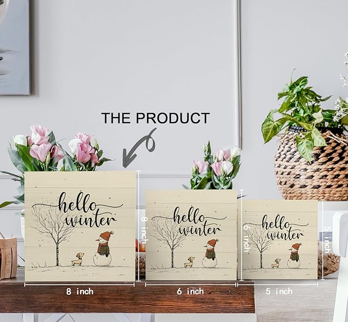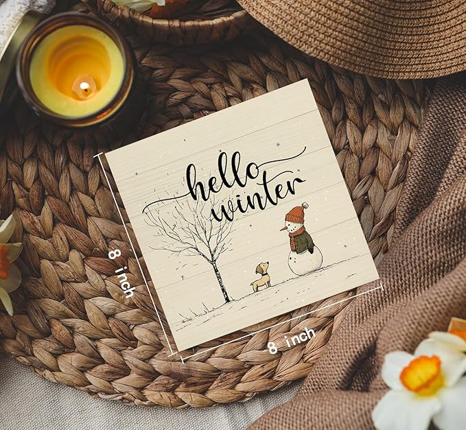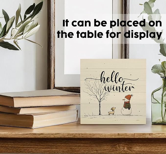 Hello Winter Sign, Christmas Snowman Snowflake Wooden Box Sign, Snowman Christma Decorations, Winter Christma Wood Signs for Home Office Desk Table Shelf Decor, 8x8 Inch
