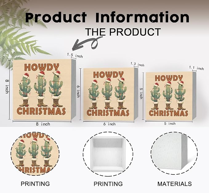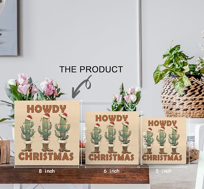 Howdy Christmas Western Cactus Cowgirl Boots Wooden Box Sign, Country Christmas Wood Signs For Home Office Desk Shelf Table Decor, Western Decorations, 8x8 Inch